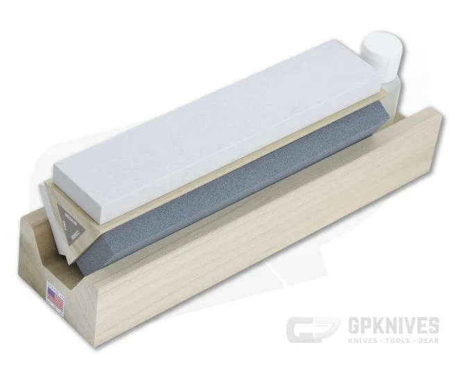 Arkansas Tri-Hone Sharpener with 8″ coarse, medium and fine Arkansas stones. Includes fine, light honing oil. Wipe or wash clean after using. Rotating wood block.