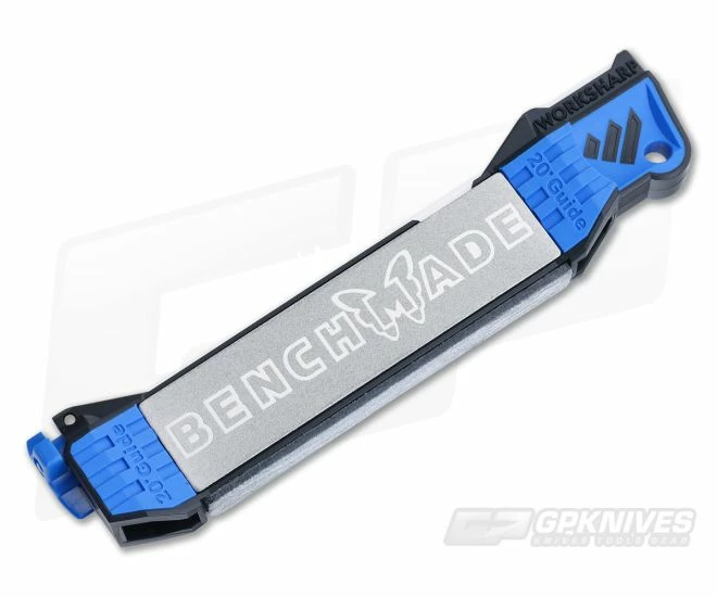Designed and built in the USA by Work Sharp Knife & Tool Sharpeners for Benchmade Knives, the Guided Field Sharpener is perfect for all your knives no matter where you are. Five abrasive steps provide a complete sharpening solution. All elements are self contained and require no assembly in the field.