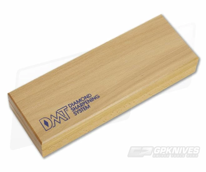 DMT Diamond Whetstone Sharpener with Extra Coarse grit 220 diamond mesh. Steel molded over plastic base with diamond coating. Uses water for lubrication. Unique pattern reduces sharpening time. Includes instructions and wood storage box.