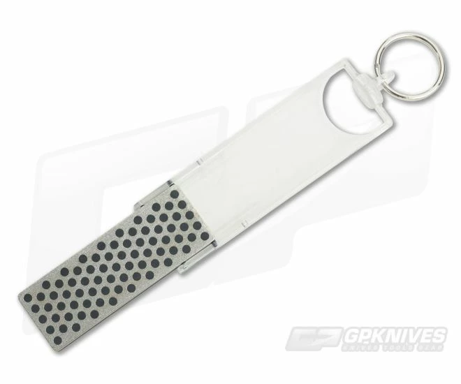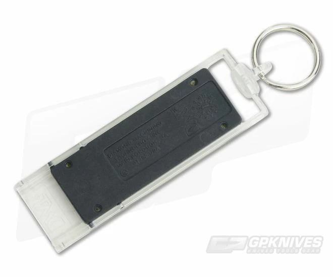 The DMT Diamond Mini-Sharp with Extra Coarse 220 mesh diamond. Steel molded over plastic base with diamond coating. Uses water for lubrication. Unique pattern reduces sharpening time. Folds to 3.5″ for keychain carry.