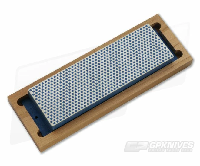 DMT Diamond Whetstone Sharpener with coarse 325 mesh diamond. Steel molded over plastic base with diamond coating. Uses water for lubrication. Unique pattern reduces sharpening time. Includes instructions and wood storage case.