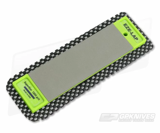 The Eze Lap Duo-Grit Bench Stone is a Diamond Stone with a superfine 1200 grit diamond abrasive on one side and 400 grit medium diamond abrasive on the other. No oil or water needed. Non-slip mat included for use.
