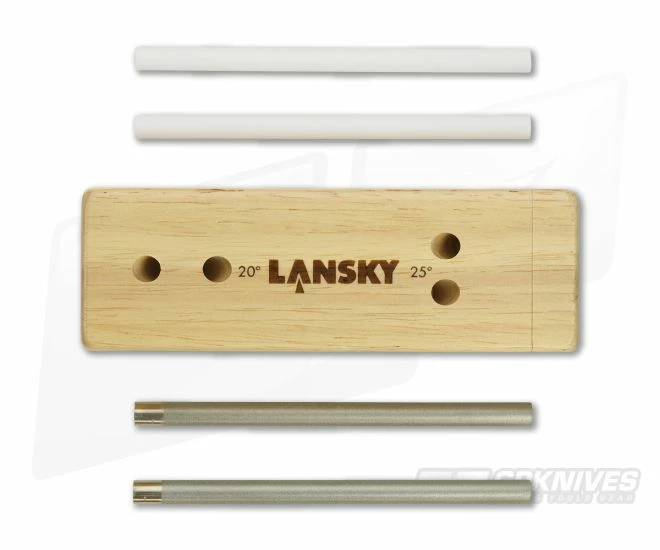 Lansky 4 Rod Turn Box Diamond/Ceramic Sharpener with Two medium grit Diamond rods (sharpening) and Two fine grit white Ceramic rods (finishing). Two preset sharpening angles 25 degree medium and 20 degree fine. Rods store inside base of turn box which acts as rod holder during sharpening. Easily used right or left handed. Includes instructions.